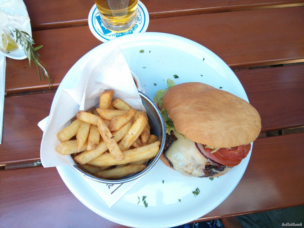 Für den Hauptgang habe ich mir einen D.C Burger bestellt und dazu gab es hausgemachte Pommes. Im Flatschers habe ich diesen Burger am liebsten. Speck, Käse, Tomaten und Salat lassen mein Herz springen. Die Secret Burger Sauce ist sehr zu empfehlen! Mein Freund hat Steak bestellt und war davon hochbegeistert. Toll finde ich, dass man in der Speisekarte über die verschiedenen Steakarten aufgeklärt wird. Ich bestelle nie Steak und finde diese Aufschlüsselung sehr aufschlussreich. Das Essen von meinem Freund konnte ich nicht fotografieren. So schnell konnte ich nicht schauen und das Fleisch wurde schon seziert.